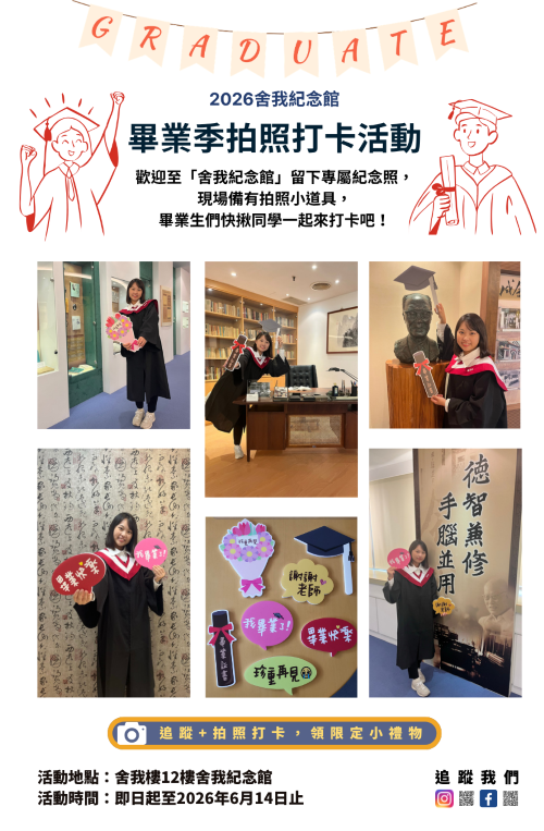 各位畢業生們,準備好迎接人生新篇章了嗎? 在離開校園前,別忘了和三五好友一起來到「舍我紀念館」打卡留念!
