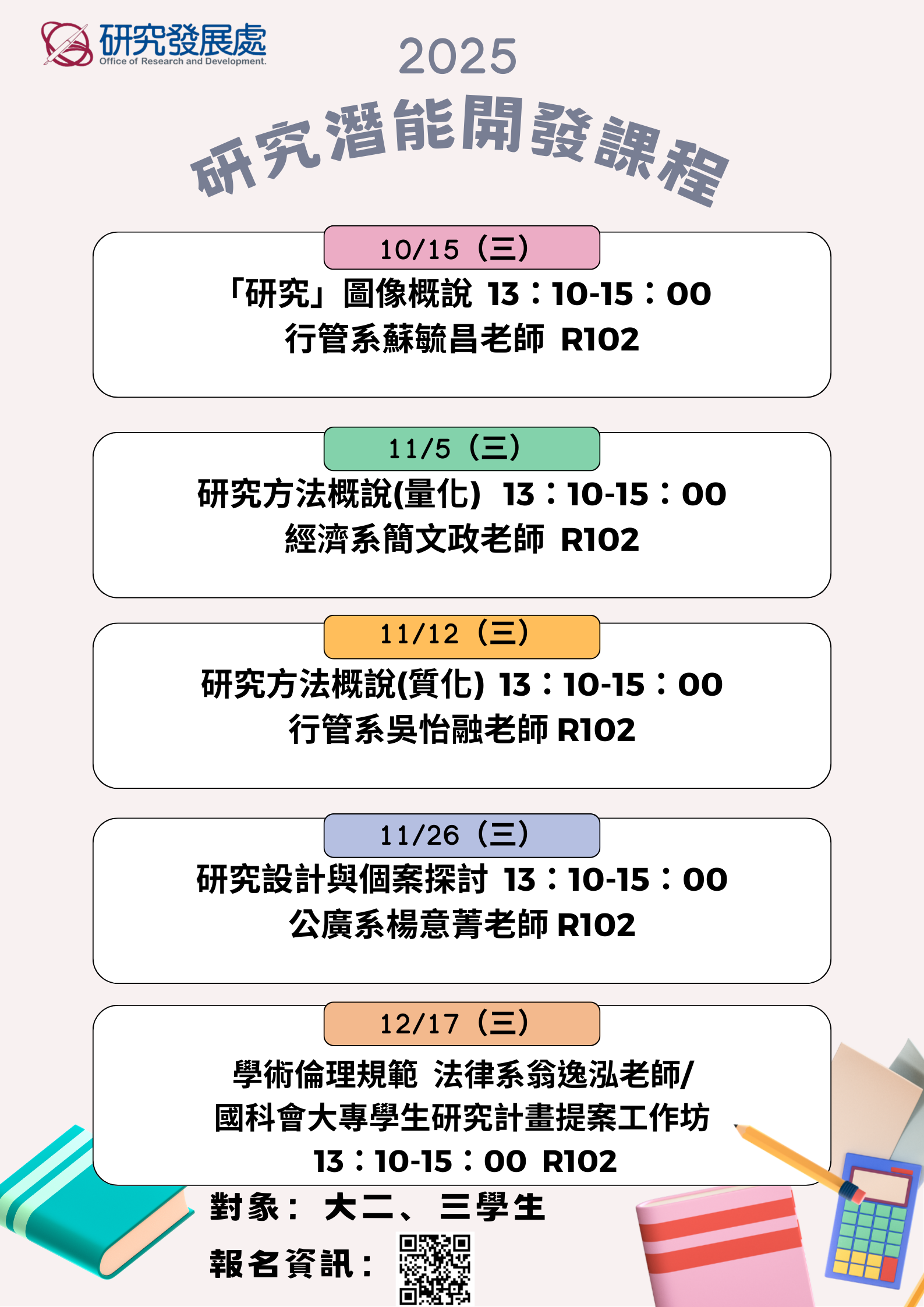 研發處於本學年持續邀請幾位經驗豐富老師,進行大專學生研究潛能開發課程,提供本校大二、大三學生基礎的研究課程,包含「研究圖像概說」、「研究方法概說(量化)」、「研究方法概說(質化)」、「研究設計與個案探討」、「學術倫理規範」五堂課,最後辦理「大專學生研究計畫提案工作坊」,鼓勵學生們進行國科會大專學生研究計畫提案申請。