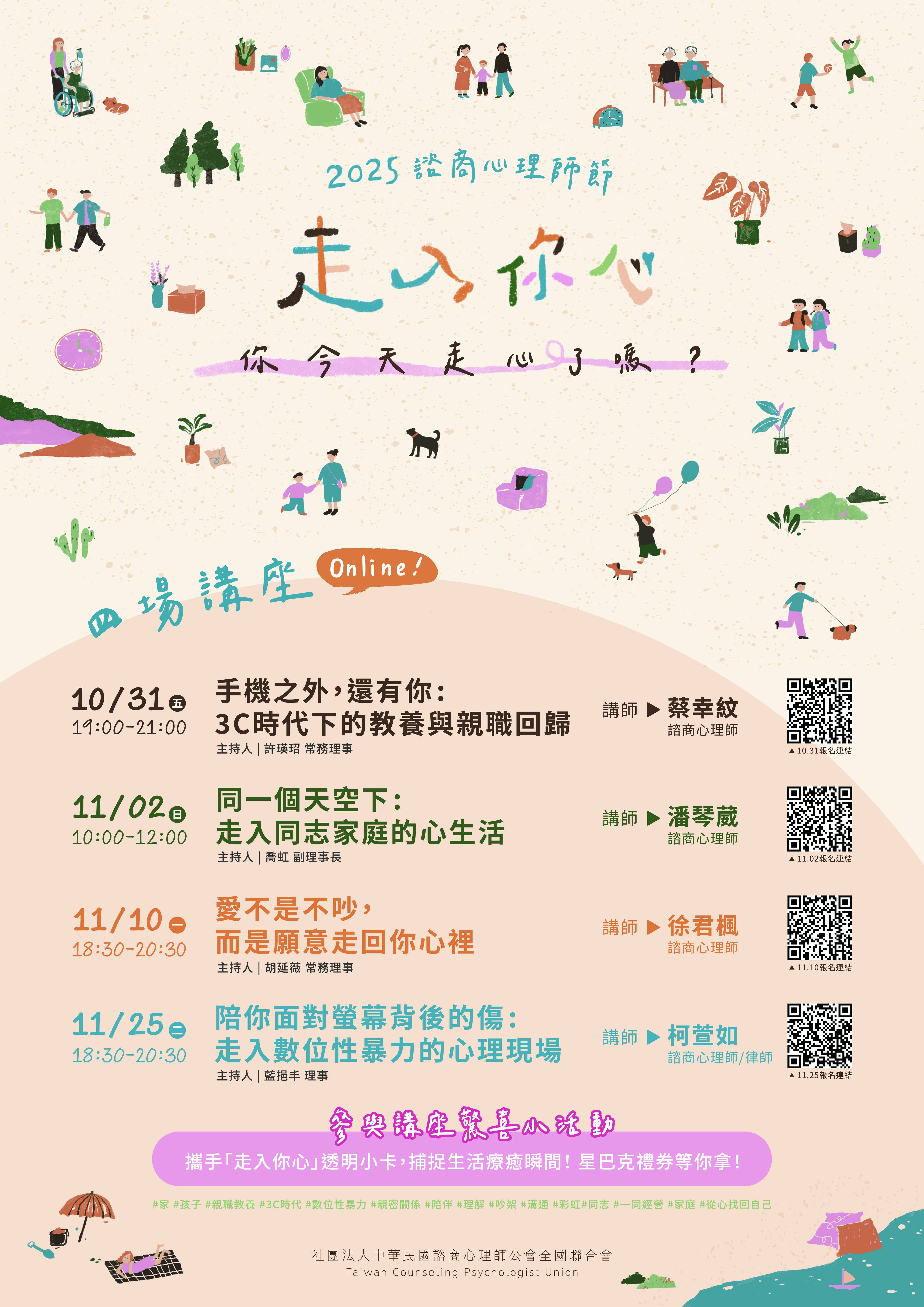 二、本年度諮商心理師節以「走入你心」為主題,關注不同人生階段與多元族群的心理需求。心理健康不僅是在困難時刻求助,更存在於日常生活中。透過此次活動,我們期盼引導社會看見:心理需求是真實且多樣的,值得被理解與照顧;也提醒每個人在生命歷程階段,適時停下腳步,傾聽內在、照顧自己。