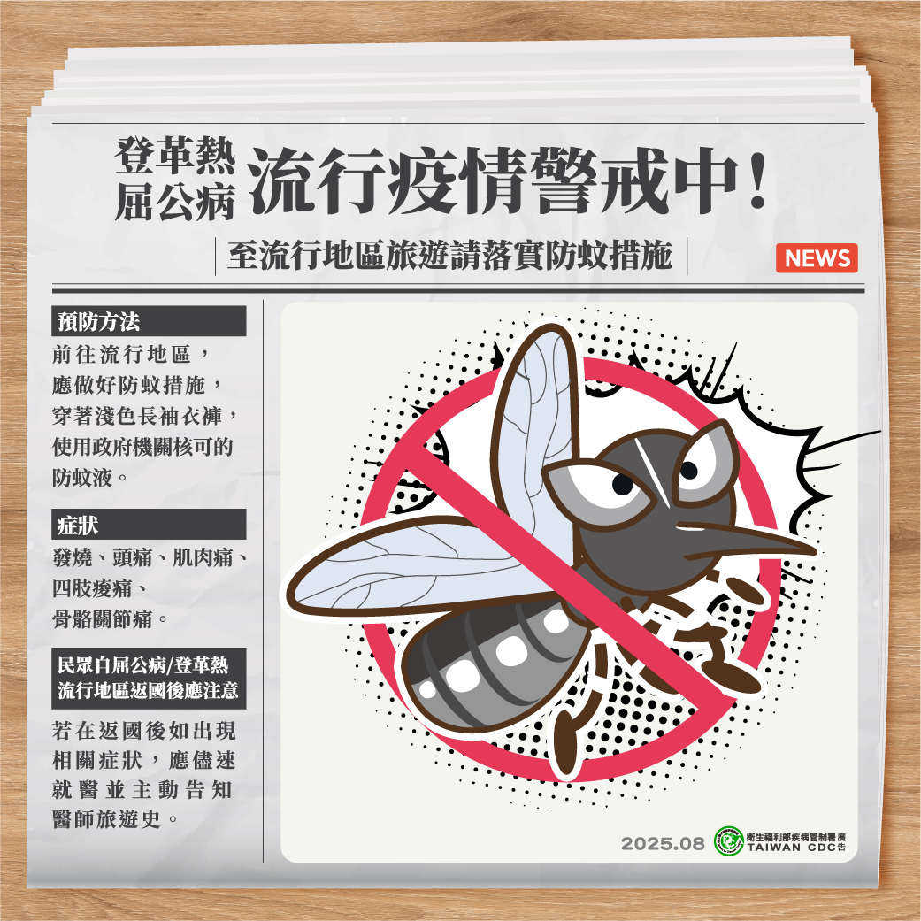(二)寒假期間教職員工生至國外旅遊、探親等活動機會增加,爰請加強對其進行衛教宣導,包含:旅遊時做好防蚊措施、自流行國家返國後應自主健康監測14天,如出現發燒、頭痛、後眼窩痛、肌肉痛、關節痛及出疹等疑似症狀,應儘速就醫並主動告知旅遊史,以利醫師診斷及治療。