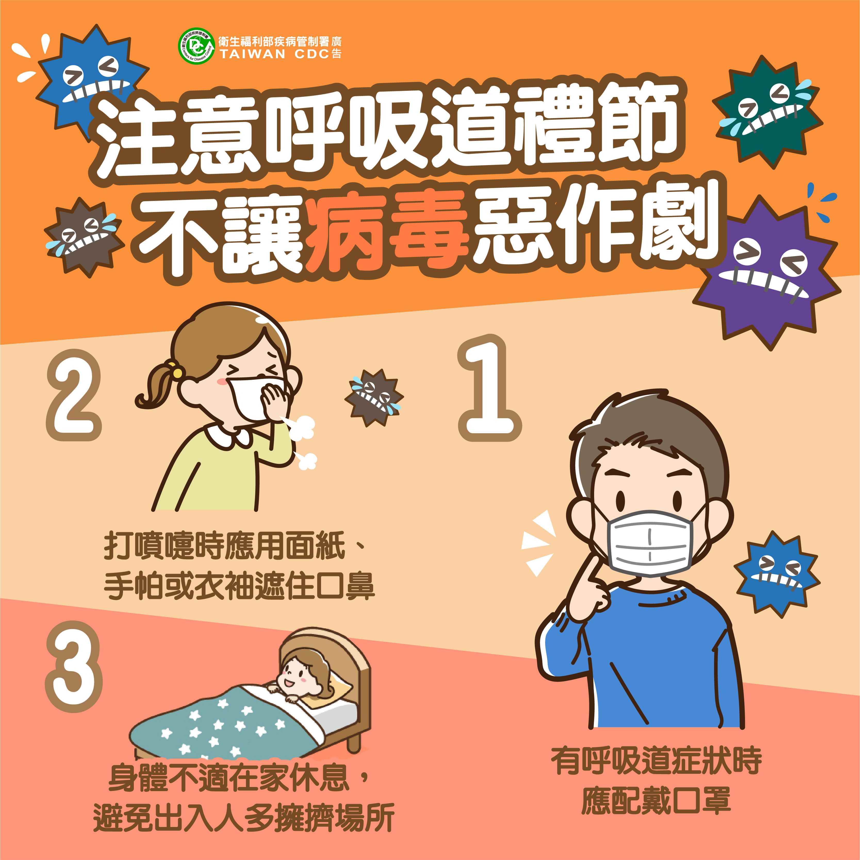 一、加強教職員生嚴重特殊傳染性肺炎之衛教,宣導呼吸道禮節重要性,避免病毒傳染,強化自我保護技巧。