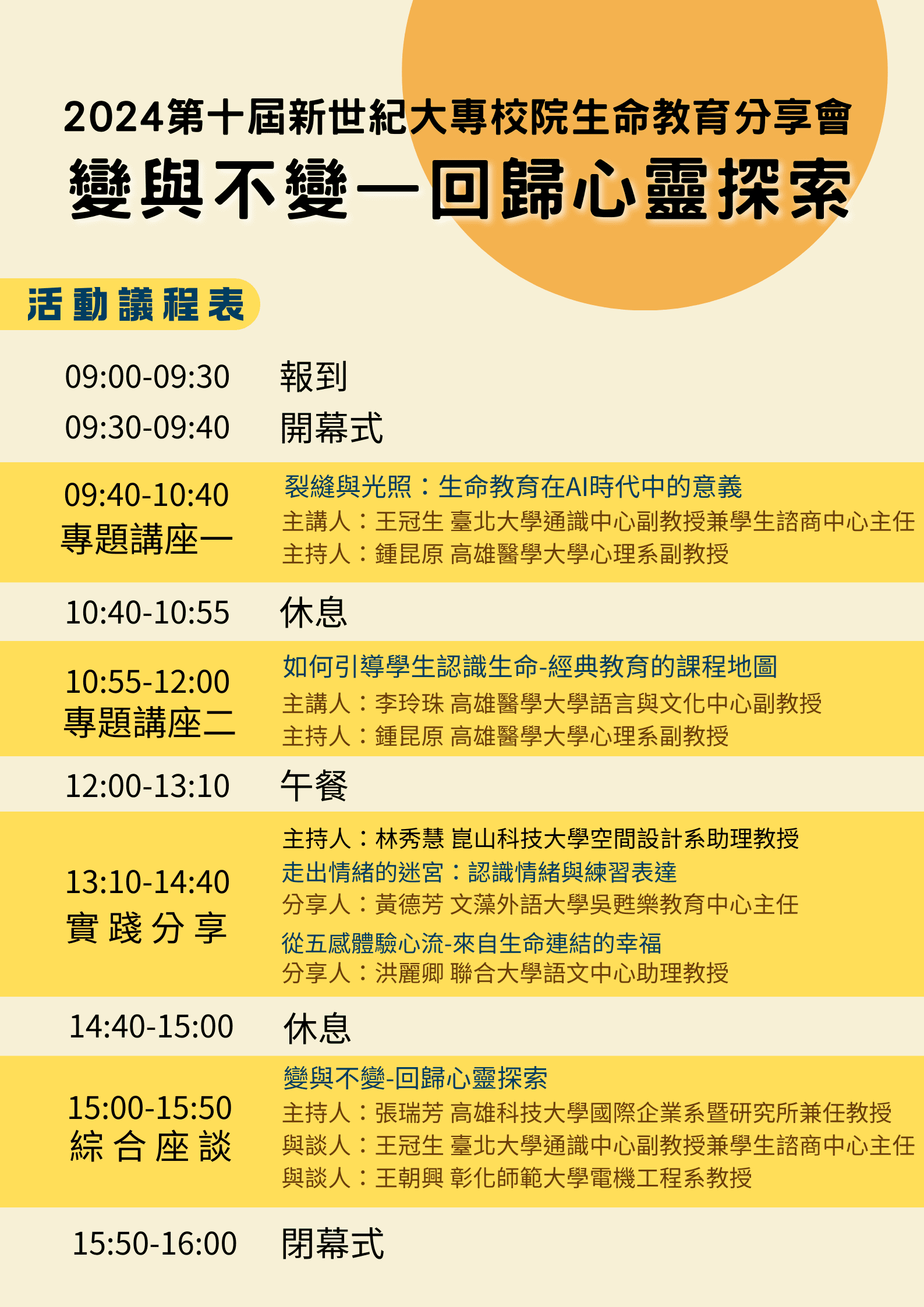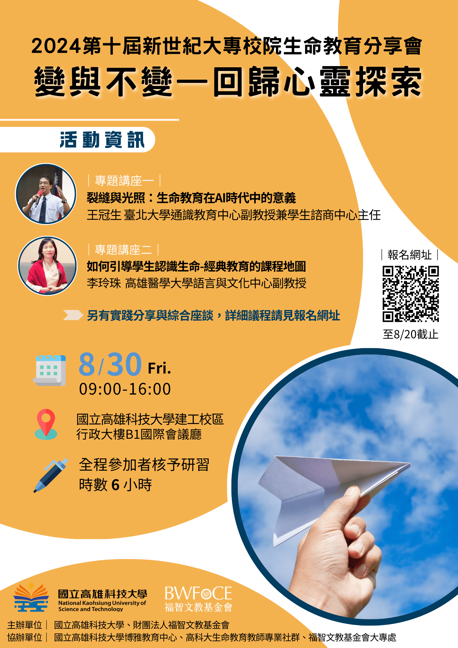 一、旨揭分享會係由本校博雅教育中心、生命教育教師專業社群與福智文教基金會合作舉辦,活動主軸為「變與不變 ̇回歸心靈探索」,將邀請致力於大專校院推動生命教育或將生命教育融入教學的教師們,就其專業角度,規劃設計的教案,推動的經驗及學習心得與本此活動參與者們分享,期望結合一群同心同願的教育工作者,透過交流討論,找到生命教育的核心價值與意義,共創美善和樂的世界。