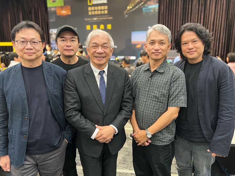 圖四:世新大學為今年大賽協辦單位,投入數媒系、圖傳系師資、技術與設備資源,世新數媒系主任陳學聖(左起)、圖傳系主任鄭旭峰、校長陳清河、世新校友《國家地理》攝影師陳郁文與圖傳系教師王鴻駿合影