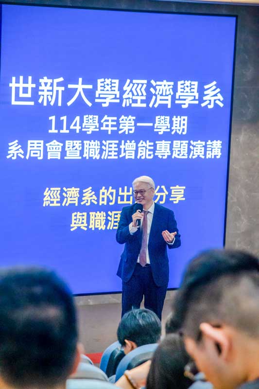 世新大學經濟學系校友、台灣金融研訓院院長高一誠,日前(10/8)返校參加經濟系周會暨職涯增能專題演講,以「經濟系的出路分享與職涯規劃」為題,分享求學與職涯歷程。他以輕鬆幽默的語氣,結合深刻的經驗,鼓勵學弟妹在快速變遷的時代中找到熱情與方向,並以實際行動迎接挑戰。