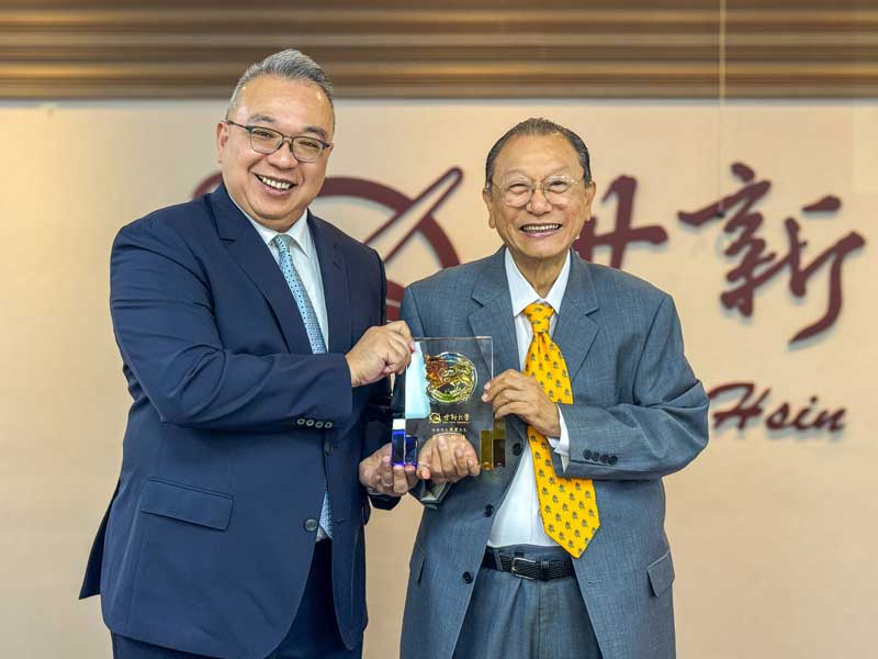 圖二:世新校友、資深媒體人戴震(右)宣布捐贈300萬元給母校,副校長林恒志(左)為其頒發紀念碑與感謝狀