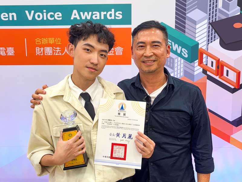 圖四:蔡覲安(左)與世新廣電系同學合作的廣播節目《被遺忘的國土》榮獲第22屆金聲獎社會關懷節目獎,右為指導老師宋修聖。(蔡覲安提供)