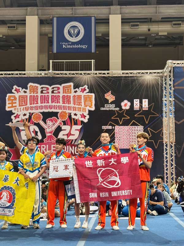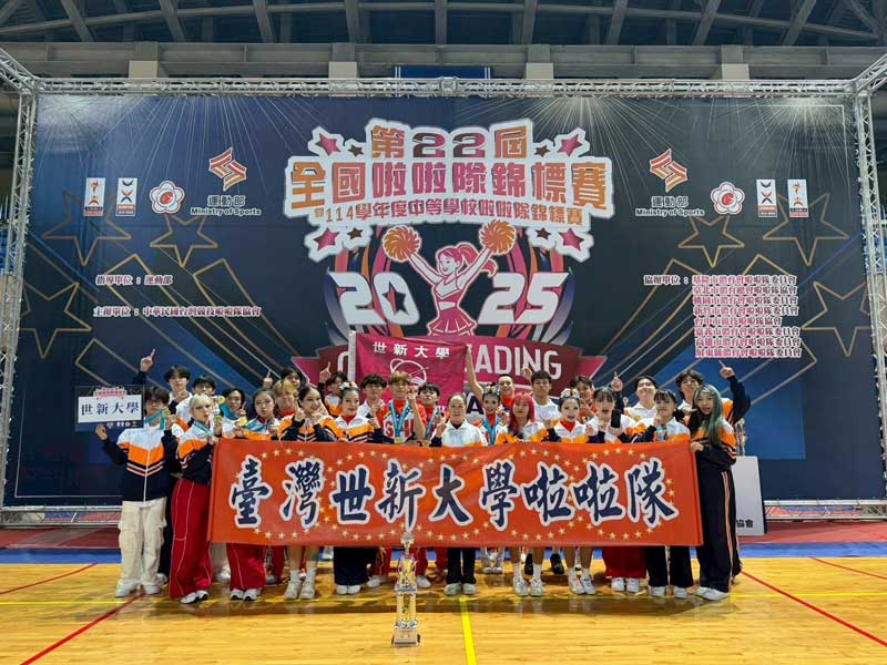 世新大學啦啦隊以壓倒性表現,於2025年第22屆全國啦啦隊錦標賽中奪下5金2銀1殿共8項殊榮,成為本屆賽事焦點。總教練李敏玲表示,隊員們幾乎每天都在學校練習,無休假地全力備賽,用汗水與毅力展現了世新學子的堅韌與團隊精神,最終為學校贏得了榮耀。