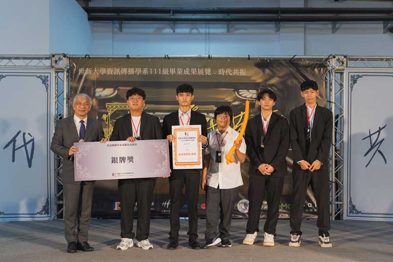 圖三:世新大學校長陳清河(左一)頒發資傳系畢業專題銀牌獎予專題小組「青山」