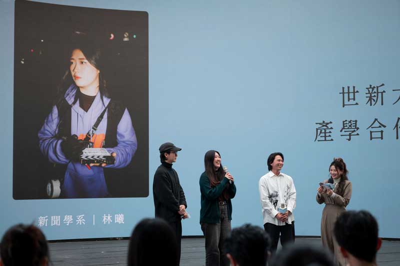 圖三:世新新聞系學生林曦(左二)分享「微短劇製作系列」課程成果與心得