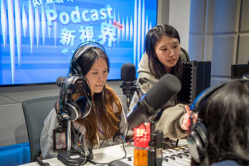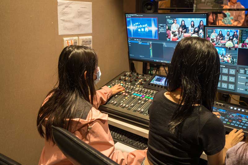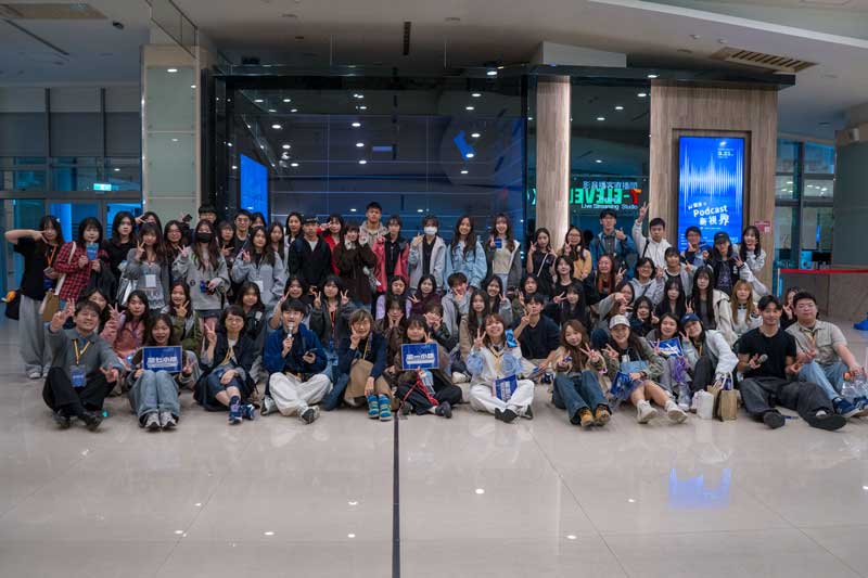 在Podcast錄音實作中,學生走進校內錄音室,實際面對業界等級的收音設備與控台介面,將課堂上完成的企劃稿轉化為節目內容。有組別在錄製時,索性把參與活動的觀察、緊張與興奮直接說進節目裡,讓錄音過程變成一場真實對話,也為作品留下當下心情的紀錄。接續安排的影音播客直播體驗,則讓學員輪流嘗試主持、導播、成音與直播製作,透過鏡頭切換與現場節奏協調,感受聲音與影像結合後,節目呈現層次如何被拉開。
