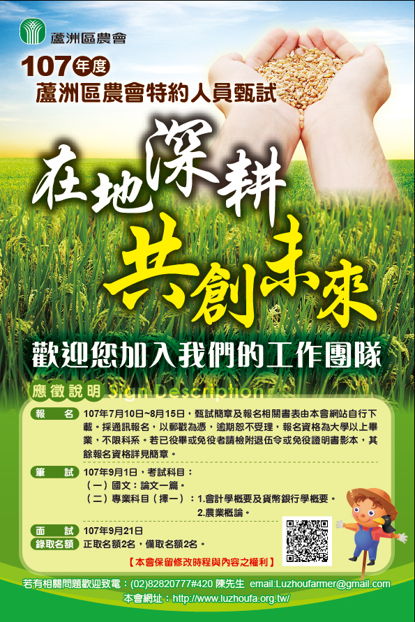 蘆洲區農會「107年度特約人員甄試」資訊。