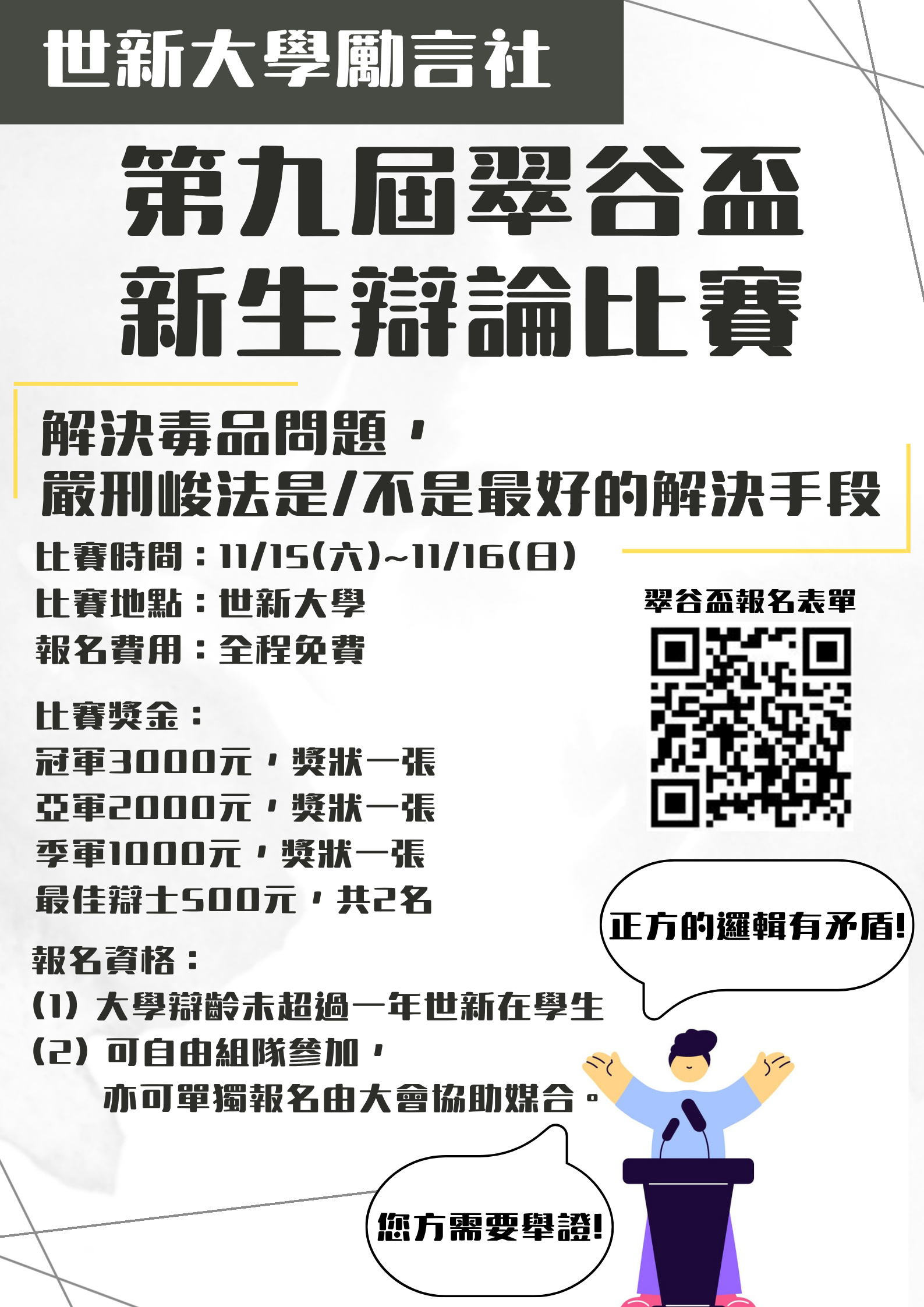 2.大學期間辯齡未超過一年之世新大學在學生(含轉學生、境外生),可自由組隊參加,共 計8隊。