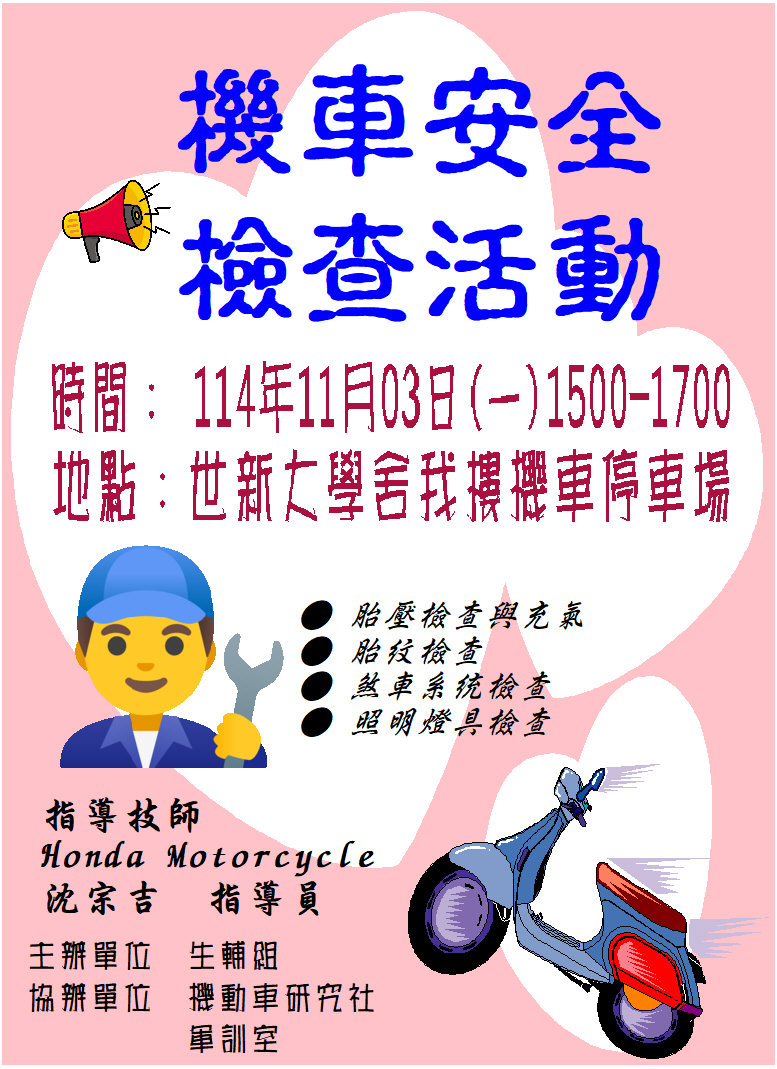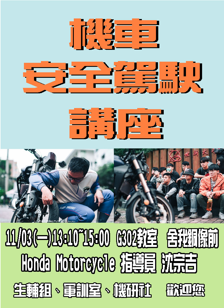 一、活動宗旨:本活動的目的是讓學生能夠了解機車有關安全駕駛知識,並透過專業機車技師,提供簡單而有效的機車安全檢查教學,讓學生了解機車日常檢查的重要性,降低行車危險,確保行車安全。二、主辦單位: 世新大學生輔組三、協辦單位: 世新大學軍訓室、機動車研究社四、活動時間: 114年11月3日(一)1300-1700五、活動對象: 世新大學學生六、活動規劃:(一)1310-1400/G302教室/安駕課程講解 (二)1410-1500/舍我銅像旁空地/安駕動作演練 (三)1510-1700/舍我樓機車停車場/安全檢查教學七、講座:沈宗吉 (HONDA機車安駕團隊)八、歡迎同學踴躍參加。